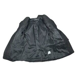 The J. Crew Going Out Blazer in Black Lurex Tinsel Tweed with an Open Front is a stylish and versatile piece perfect for various occasions including business, formal events, and casual outings. Made of wool with a polyester lining, this short-length blazer features long sleeves and a regular fit. The black tweed fabric with accents of glimmer, glitter, tinsel, sparkle, shimmer, and shine adds a touch of glam to the classic design. With features like shoulder pads, pockets, and a collared neckline, this blazer from J. Crew is a must-have for any fashion-forward woman looking to make a statement.