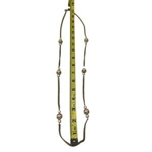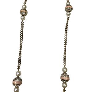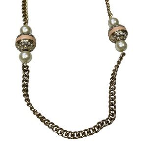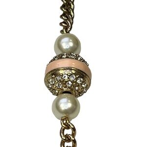 J crew gold chain with rhinestone diamond spheres and faux pearls. Pink stripe accents. Good condition