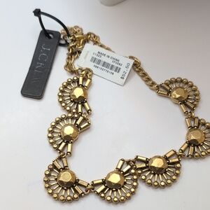 This exquisite J. Crew necklace features a series of intricately designed fan-shaped elements in a warm gold tone, creating a vintage-inspired look. The delicate chain and smooth polished centers of each fan add a touch of elegance, making it a perfect accessory for any occasion.