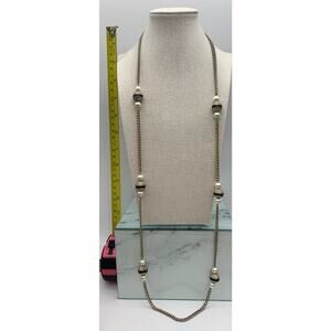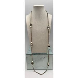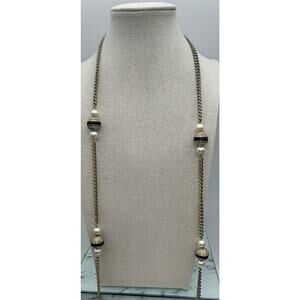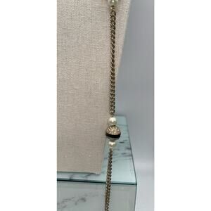 The J Crew Gold Tone Pave Rhinestone Stations With Faux Pearls Necklace is a stylish and elegant piece of fashion jewelry. Featuring a pavé setting style with gold tone accents and white/colorless rhinestones, this necklace is signed by J.CREW and has a spring ring closure for a secure fit. Perfect for adding a touch of beauty and sophistication to any outfit, this station necklace exudes a sense of fashion and glamour.