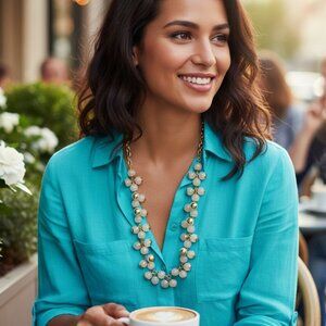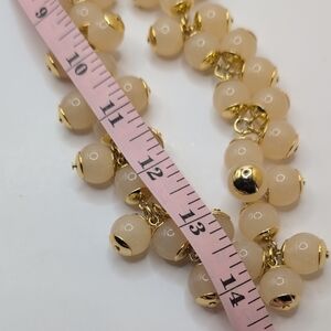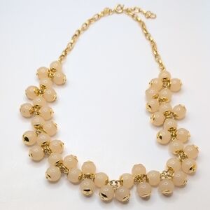 This beautiful necklace showcases a cluster design with larger round beads and smaller irregularly shaped beads, creating a unique texture. The soft peachy cream color adds a delicate touch, making it a versatile accessory for various occasions. Its length allows it to fall gracefully to mid-chest or lower when worn.
