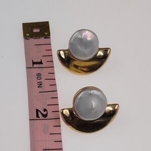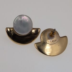 These J. Crew earrings feature a striking geometric design with a blend of gold and flat bead pearl tones. The minimalist style is enhanced by a luminous flat bead cabochon, creating a sophisticated and modern look. Perfect for adding a touch of elegance to any ensemble.