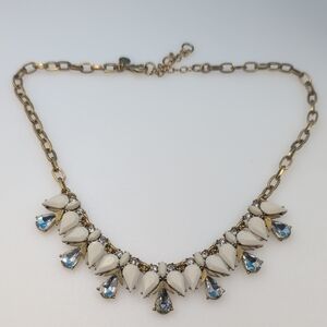 This exquisite J. Crew necklace showcases a harmonious blend of gold and vanilla cream white tones, featuring teardrop-shaped pendants with a pearlescent finish. The gold-toned chain and settings elegantly frame each pendant, creating a sophisticated and symmetrical design. Perfect for adding a touch of elegance to any ensemble.