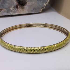 This exquisite bracelet from J. Crew showcases a harmonious blend of gold and yellow hues, highlighted by a chevron pattern that encircles the entire piece. The glossy enamel finish adds a touch of elegance, making it a standout accessory for any occasion. Very good condition.