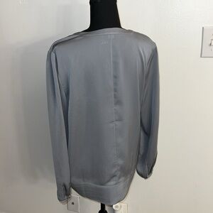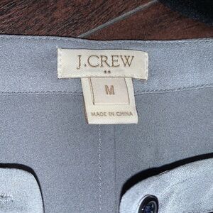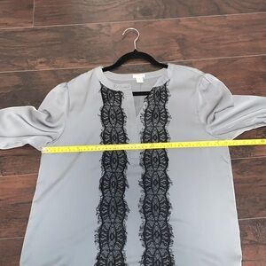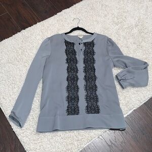 J. Crew Gray Blouse with Black Lace, sz Medium. Two tiny pin pricks on the shoulder (pictured), otherwise in excellent condition. Lightweight with silky-like material. An excellent addition to your closet.