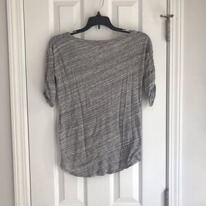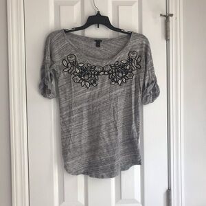 Gray heathered scoop neck tee with rolled tab sleeves and black & white floral embroidery across chest by J. Crew.