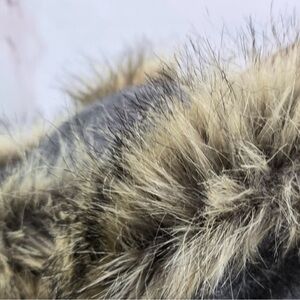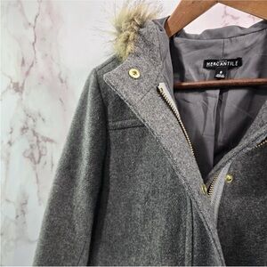 Stylish gray pea coat. Features faux fur trim on hood. Front pockets with button details. Perfect for chilly days.