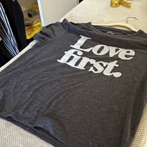 Soft gray tee with 'Love first.' print. Comfortable and stylish. Perfect for casual wear.