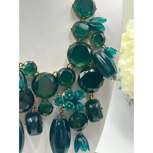 Elegant dark emerald and teal acrylic stones and stylized floral baubles in a brass setting make this stunning piece that will standout as a bold statement against the backdrop of an otherwise ordinary dress..or wear it in a cascade of a soft ruffle neckline of creamy crepe..or even wear with a t-shirt and jeans for a dash of whimsy.. 11.5 drop from nape of neck..