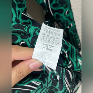 J. Crew Green Black Retro Floral Popover Blouse Top Women’s Size 2. Made in China. Has a few pulled threads. 100% Polyester. Style B7360. Machine washable. Retro Floral Pattern in Green, Black and White. Button Closure at Back of Neck with Keyhole Detail. 3/4 Sleeve. Tunic style hits at the hip.