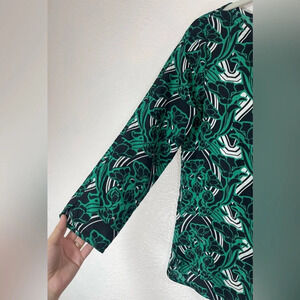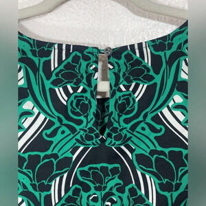 J. Crew Green Black Retro Floral Popover Blouse Top Women’s Size 2. Made in China. Has a few pulled threads. 100% Polyester. Style B7360. Machine washable. Retro Floral Pattern in Green, Black and White. Button Closure at Back of Neck with Keyhole Detail. 3/4 Sleeve. Tunic style hits at the hip.
