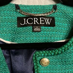 A vibrant emerald green cropped blazer with a collarless design and structured fit.