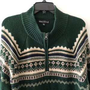 Stylish green sweater with cream patterns. Features a half-zip design. Perfect for casual wear.