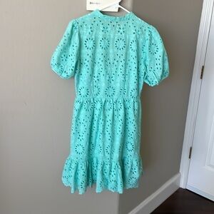 This casual mini sundress from J. Crew features a vibrant green hue with charming ruffled details and a buttoned front. Designed with short puff sleeves and a crew neck, it offers a playful and relaxed style perfect for sunny days.
