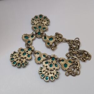 This exquisite J. Crew necklace showcases a captivating blend of green and gold hues, featuring intricate floral designs that make it a standout accessory. The necklace's symmetrical arrangement of floral clusters adds a touch of elegance and sophistication, perfect for elevating any ensemble. excellent condition
