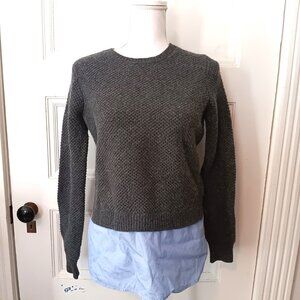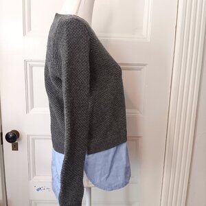 Cool J. crew layered look textured crew neck gray wool pullover sweater with blue chambray shirttail hem and back zipper