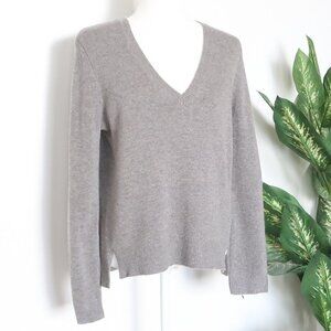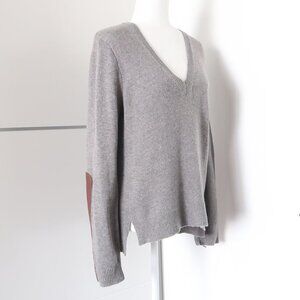 J. Crew Grey Wool V-neck Long Sleeve Pullover Sweater w Brown Leather Panels S