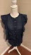 Excellent condition beautiful cotton navy blue blouse with flutter ruffle with embroidery at shoulder, more embroidery at button placket, pleating. As seen on Heather on the show Life in Pieces.