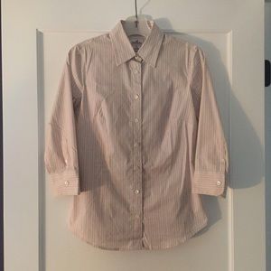 Classic striped button up from J Crew. Great for the office or with jeans on the weekend. Shirt is in perfect condition and worn only once. Stripes are orange, yellow and blue. 97% cotton and 3% spandex for just the right amount of stretch. 3 quarter sleeves.