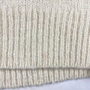 Preowned. Several small spots - arms have orange markings, front bottom hem has red marks (both unstain treated). PIlling due to fabric content.