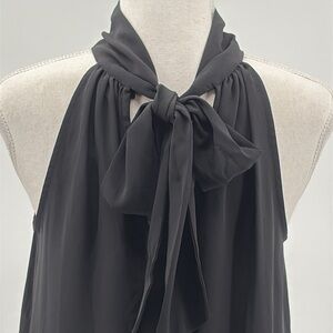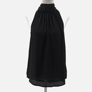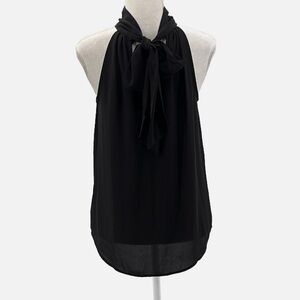 J. Crew Halter Neck Back Tie Sleeveless Blouse in Black - NEW - Size 2. New with tag. Semi-sheer, curved hemline, halter neckline, high neck, tie at neck back, very flowy. Approximate measurements: 18" pit to pit, 26" length.