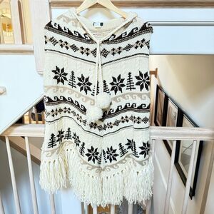 J. Crew Hand-knit 100% Wool Fair isle Motif Fringe Hooded Poncho One Size