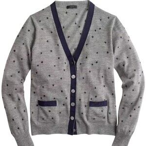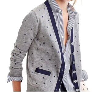 This J. Crew Harlow cardigan is a stylish and cozy addition to any wardrobe. Crafted from merino wool, it features star embroidery, a V-neck, pockets, and a button front, all in a chic gray and navy palette. Retail $118