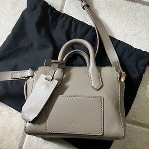 Gently used a couple of times. In great condition. The only flaw is some minor indentation caused by the strap in storage (see picture 1 and 2). Gold hardware perfectly shiny. The color is shown truthfully in the photos. It's a warm taupe grey and easily match everything. Thich soft Italian leather. 5 1/2"H x 7 ¼"W x 4"D. 2 1/2" Handle drop. 22 1/2" strap drop. Removable, adjustable strap. Original dust bag (black, shown in the 2nd photo) is included.