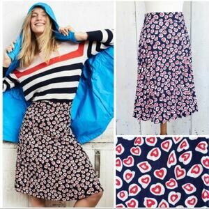 J. Crew Heart Print Pleated Midi Skirt Blue Red Crepe A Line Classic Preppy 8