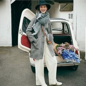 Preowned item in excellent overall condition. No odors, stains, or holes. Fully lined. The car coat. Inspired by the swingy coats of the1950s, timeless black and white herringbone that goes with everything in your closet.