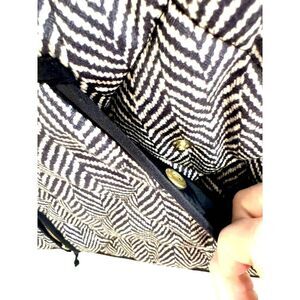 This quilted puffer is as fashionable as it is warm. Herringbone pattern with zip front, black trim, and usable pockets. Size small, in excellent pre-owned condition. See photos for details and measurements.