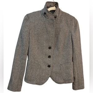 This is a preowned J.Crew Herringbone Wool-Blend Blazer, a classic and stylish piece known for its distinctive V-shaped weaving pattern. This blazer is a versatile wardrobe staple that can be dressed up or down. This blazer features a distinctive herringbone pattern in a black and white (or dark and light grey) wool-blend fabric, giving it a classic and textured appearance. Key characteristics include: The blazer has a prominent high neck button collar, adding a unique and stylish element.