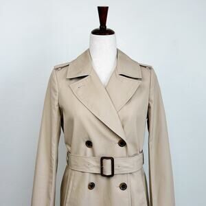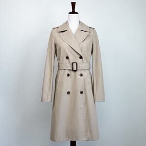 Size 0 J. Crew Icon Trench Coat. Water-repellent cotton fabric. Self tie belt. Two exterior welt pockets and one inside pocket. Lined interior and collar. So chic and timeless! No flaws, great condition!