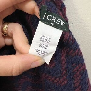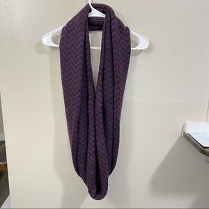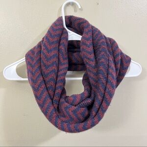 J. Crew Factory wool-blend infinity scarf with maroon and navy blue chevron striped pattern.