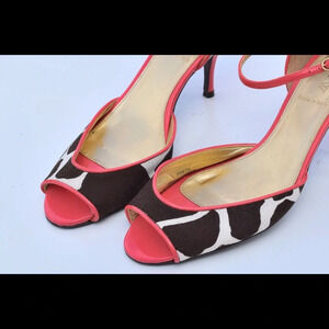 Leather lining, canvas upper. Cream & brown with coral pink trim.
