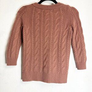 This J. Crew sweater combines style with comfort, featuring a classic cable knit design in a chic dusty pink color. Crafted from cashmere it offers warmth and durability for cooler weather. Its sleek, timeless design makes it a versatile piece for various outfits and occasions.