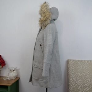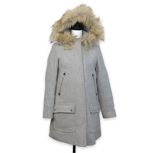 Size 0. Heather Dusk (Light Grey) color. J.Crew's best-selling classic parka has a swingy A-line shape and is made from their exclusive stadium-cloth wool, created by Italy's Nello Gori mill. Features a removable faux-fur trim on the hood, zip-closure and button-front pockets, and a locker loop chain for hanging it.