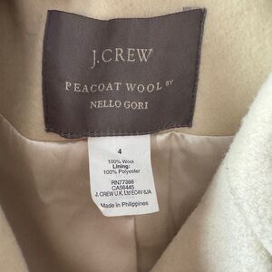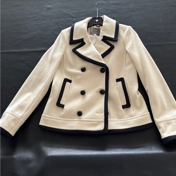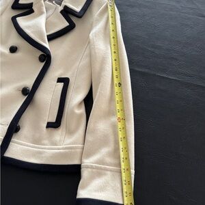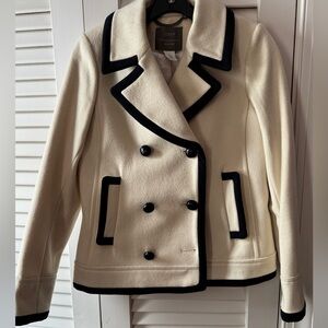 Elegant ivory pea coat featuring navy accents. Double-breasted with stylish buttons. Perfect for a sophisticated look or wear it with jeans for a casual cool look.