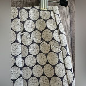 This skirt has an all over geometric circle pattern. Complete with a zipper and clasp closure at back. Fully lined in silky 100% acetate. Pockets at either side of front. 57% cotton 43% polyester.