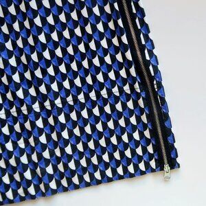Refresh your office-outfit rotation with this elegant J. Crew shift dress, featuring 3/4 sleeves, a round neckline, and exposed functional silver zippers on each side. Beautiful geometric print in purple (looks like blue in photos, but it's purple), black, and white color. Has a light stretch. Dress it down with white sneakers.