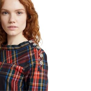 Tartan Stewart plaid shirt with jewels and funnel top. Front is shorter than back.