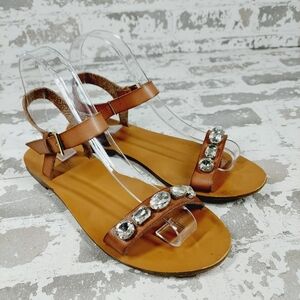 J Crew Jeweled Crystal Rhinestone Camel Brown Tan Leather Gold Buckle Ankle Strap Sandals