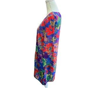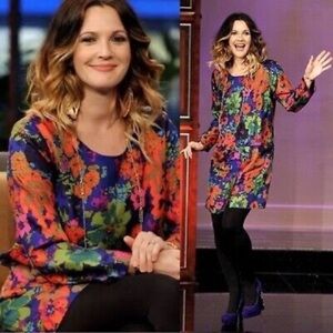 100% Silk Jules Ashbury Floral Print Dress - As worn by Drew Barrymore. Beautiful, vibrant mini-midi dress with 3/4 length sleeves and front pockets.