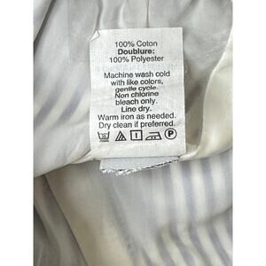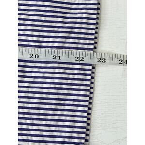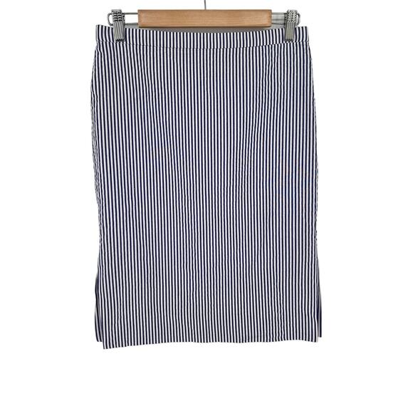 Pencil, knee length skirt with blue and white vertical stripes, small split in the back, hidden back zipper closure, and white lining.
