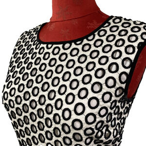 J Crew Lace Overlay Dress - a casual daytime style perfect for wedding, church, garden party - in Size 2 - cotton with embroidery - fully lined. Back zipper and basic sheath style fit - beige/white with black overlay - silk trim finishes. If you add one dress to your warm weather collection - this should be it! Gently worn - no flaws - a timeless classic look!