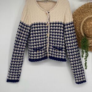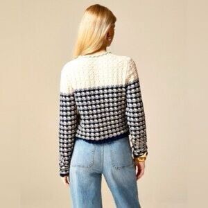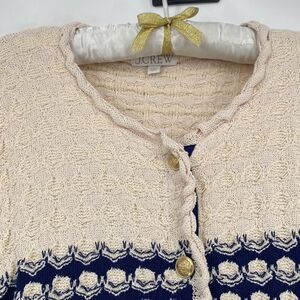 J. Crew Lady Cardigan Jacket Cropped Textured Crochet Gold Buttons Navy Cream L