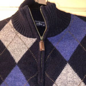 This J.Crew sweater is a classic addition to any wardrobe. Made from high-quality wool, it features a tight-knit argyle pattern with diamond accents and a full zipper. The sweater has a mock neck and elbow patches, making it perfect for any occasion, whether it's a formal event, a party, or just a casual day out. It comes in a size M and is a regular fit, with long sleeves and a stretchy fabric type.
