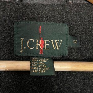 J. Crew men's leather jacket in a car coat length. Button-up front, notched lapel, and front pockets. Wool/nylon blend lining.