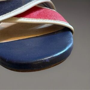 This J Crew Leather Sandal in size 7.5 features a patriotic colorblock design in red, white, and blue. The slip-on style with crisscross straps is perfect for summer, fall, or spring occasions like travel, parties, or casual wear. The flat heel and leather material make it comfortable and stylish, embodying a classic, preppy look with a nautical or 4th of July theme. Perfect for adding a touch of country club or old money charm to any outfit.