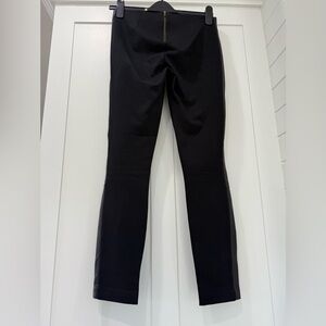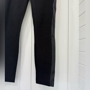 Black leggings featuring sleek leather side panels. Back zipper closure with hook and eye.